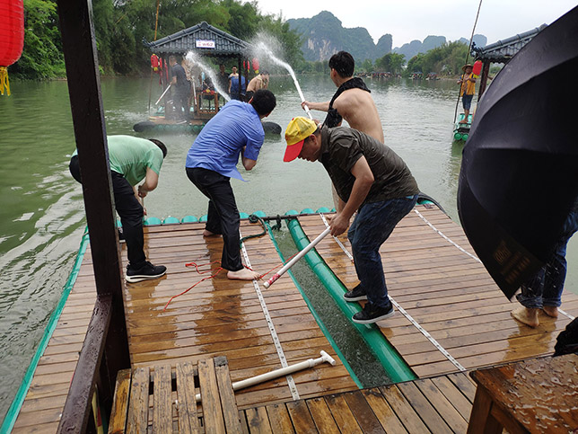 历经约40分钟左右的战斗结束,艄公缓缓把竹筏划向码头。水战非常激励,基本上所有同事都湿身了,接下来就是回酒店沐浴更衣。