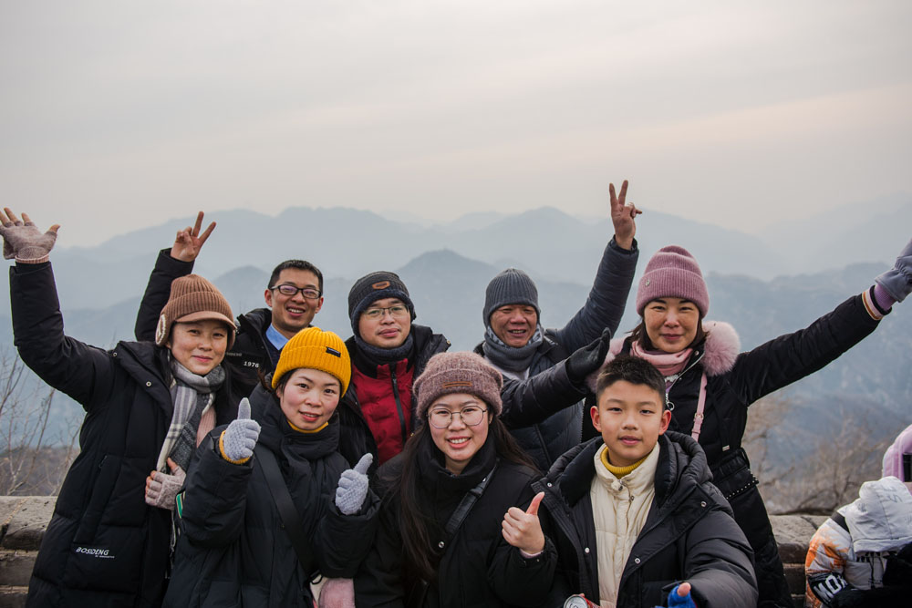 不到长城非好汉,抵达八达岭长城,天公不作美,雾蒙蒙的一片。乘坐缆车上行,然后再爬一段距离,路程有些地方很陡手脚并用慢慢往上爬,走走停停,可以欣赏风景。同事们都很开心在拍照留恋。在长城上登高望远,看着蜿蜒起伏的长城宛如一条龙,如此壮观!